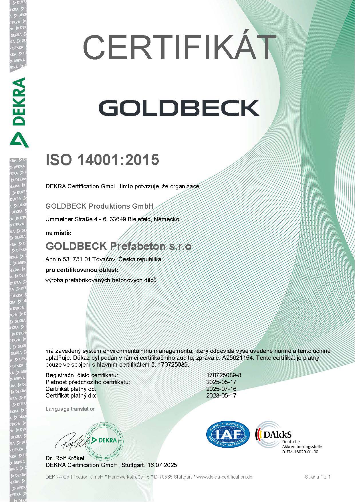 Certifikát ISO 14001 Tovačov